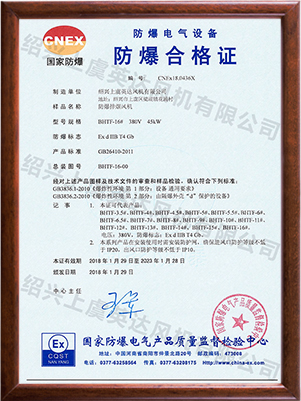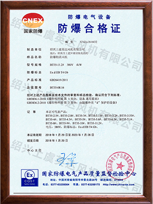 為適應(yīng)防爆環(huán)境需要,風(fēng)機可做成防爆風(fēng)機,防爆等級為EXdⅡBT4,適用于易燃、易爆氣體的場所。整機通過國家防爆認證。