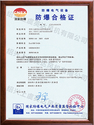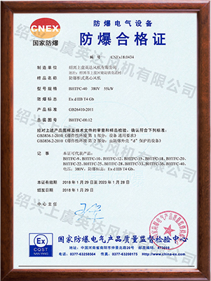 為適應防爆環(huán)境需要,風機可做成防爆風機,防爆等級為EXdⅡBT4,適用于易燃、易爆氣體的場所。整機通過國家防爆認證。